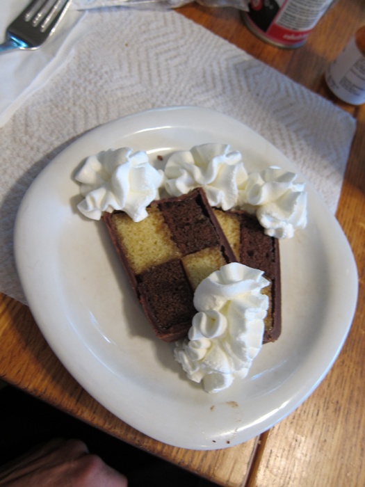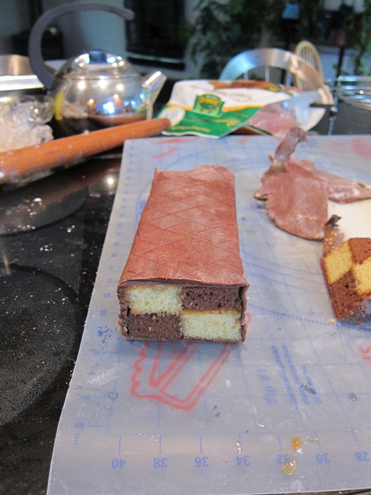 Gently press the seam closed, then invert the cake. If desired, make a checkerboard pattern in the chocolate by running the back of a knife over it. I was able to press pretty firmly without the cake collapsing. Cut off the end to reveal the patterned cake.