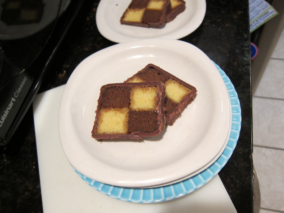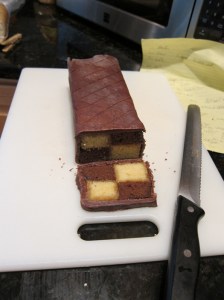 It’s the end of the month, which means it’s once again time for a Daring Bakers post! This month Mandy of What The Fruitcake?! came to our rescue last minute to present us with the Battenberg Cake challenge! She highlighted Mary Berry’s techniques and recipes to allow us to create this unique little cake with ease. The traditional Battenberg has nuts in it, is glued together with apricot preserves, and has a marzipan coating. Barf. I made a Battenberg I’d actually eat, which means chocolate, chocolate, and glued together with caramel sauce.