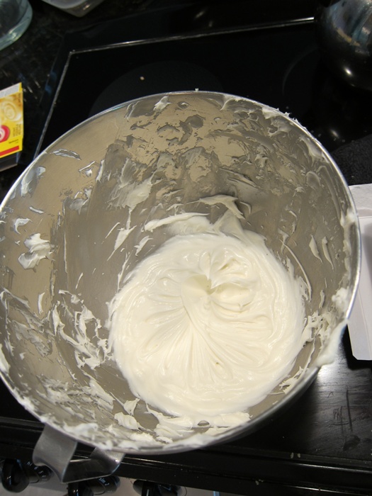 To make the frosting, first beat together the butter and cream cheese. Beat in the powdered sugar until smooth, then add the lemon extract and beat again. If you really don’t want to buy lemon extract, you can try lemon juice, but you will probably need more to get as strong a lemon flavor, which might require more powdered sugar if the frosting then gets too thin…
