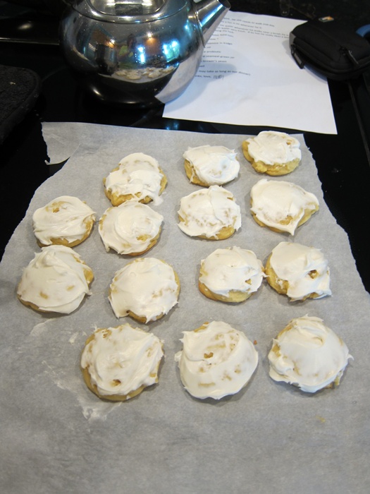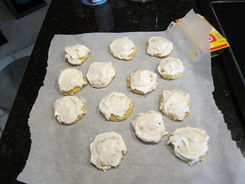 Last floor hockey of the regular season, last…batch of cookies for the regular season? Guess so! My mother’d bought a bunch of lemon pudding that it turned out she didn’t need, so I looked around for a lemon pudding cookies recipe, then slapped some frosting on top. Why on Earth not?!