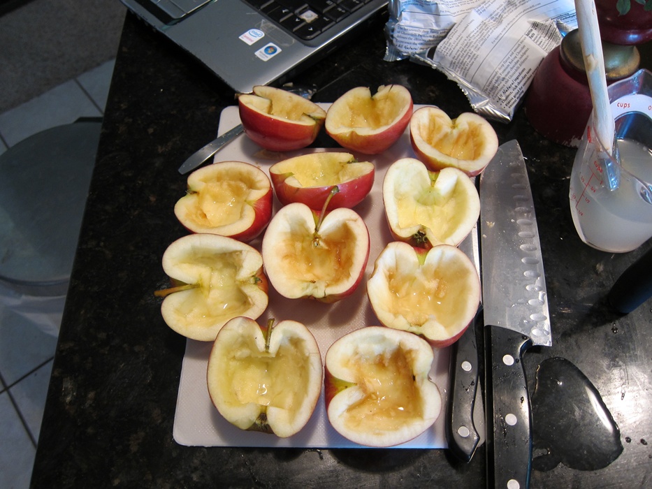 Cut the apples in half, from the top down. Using a sharp, pointy knife, cut out the insides of the apple, leaving a 1/4″ shell. You might also find a grapefruit spoon helpful. As you hollow out each half, brush the cut edges and inside with the lemon juice mixture to help prevent browning.