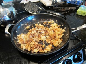 Preheat the oven to 350 degrees. Chop the apple insides into small pieces, discarding seeds and cores, then combine with the chopped onion in the pan you cooked the sausage in. Saute 6-8 minutes, until onion is tender.
