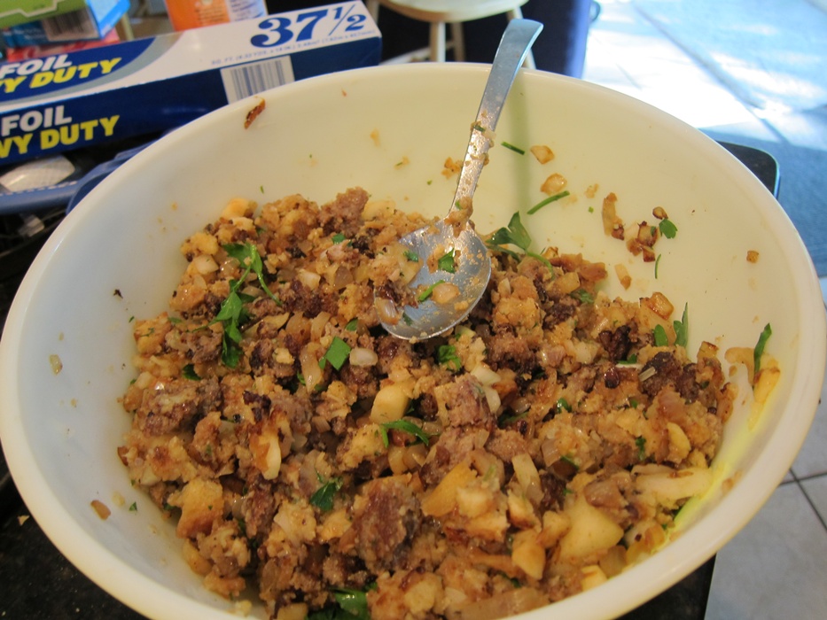 Stir together the apples and onions with the sausage and stuffing, adding the parsley as well.