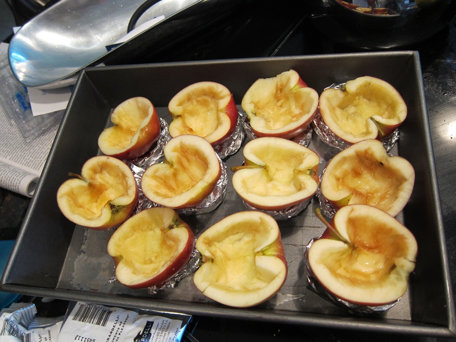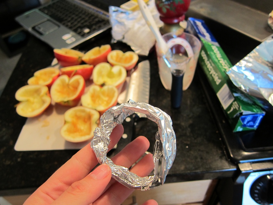 Dump any excess lemon-water out of the apple shells, then put each on a foil ring in a baking pan.