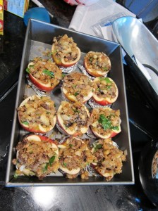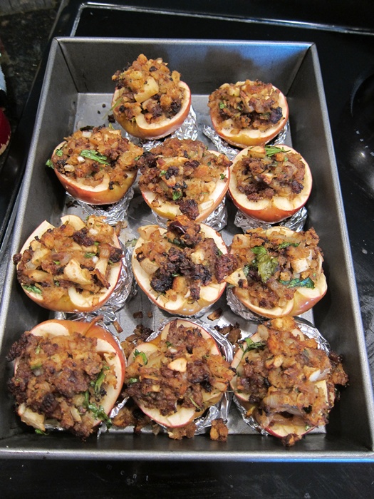 Dump any excess lemon-water out of the apple shells, then put each on a foil ring in a baking pan. Spoon the stuffing mixture into the apples, piling it up as high as is stable. Pour the cup of cider vinegar into the bottom of the pan. Spoon any extra stuffing into a loaf pan or 8X8″ baking dish. Bake 30-40 minutes, until apples are tender.