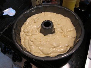You may wonder why you’re beating so long and consider stopping after 5 minutes, but I did find that the batter got lighter in color and looked fluffier by the end. Pour the beaten batter into your prepared bundt pan.