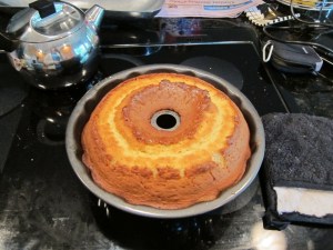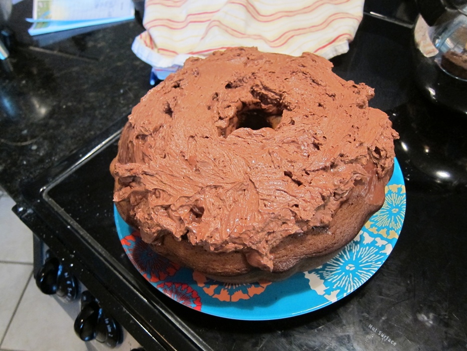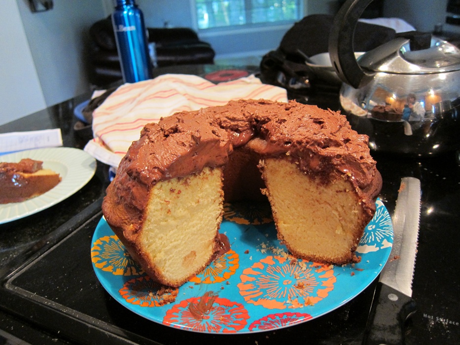 We weren’t patient enough to let the cake cool completely, so I just heaped the frosting on top, figuring it’d melt down the sides a bit. I’m not sure what a more attractive way to frost a bundt is. It’s a pretty thick, solid frosting, at least until the heat of the cake made it start dripping.