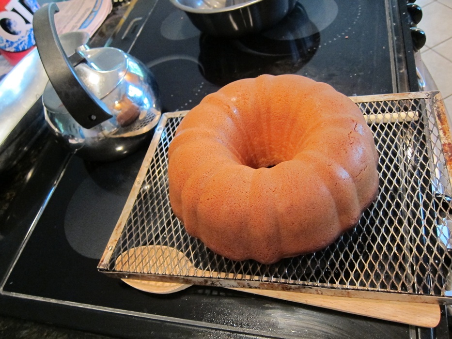 Combine all the cake ingredients in the bowl of your mixer and beat on medium speed for 20 minutes. While that’s beating, preheat your oven to 350 degrees and grease a bundt pan. Pour the beaten batter into your prepared bundt pan and bake 1 hour 20 minutes. Turn out immediately onto a wire rack and cover with a clean dishtowel while it cools.