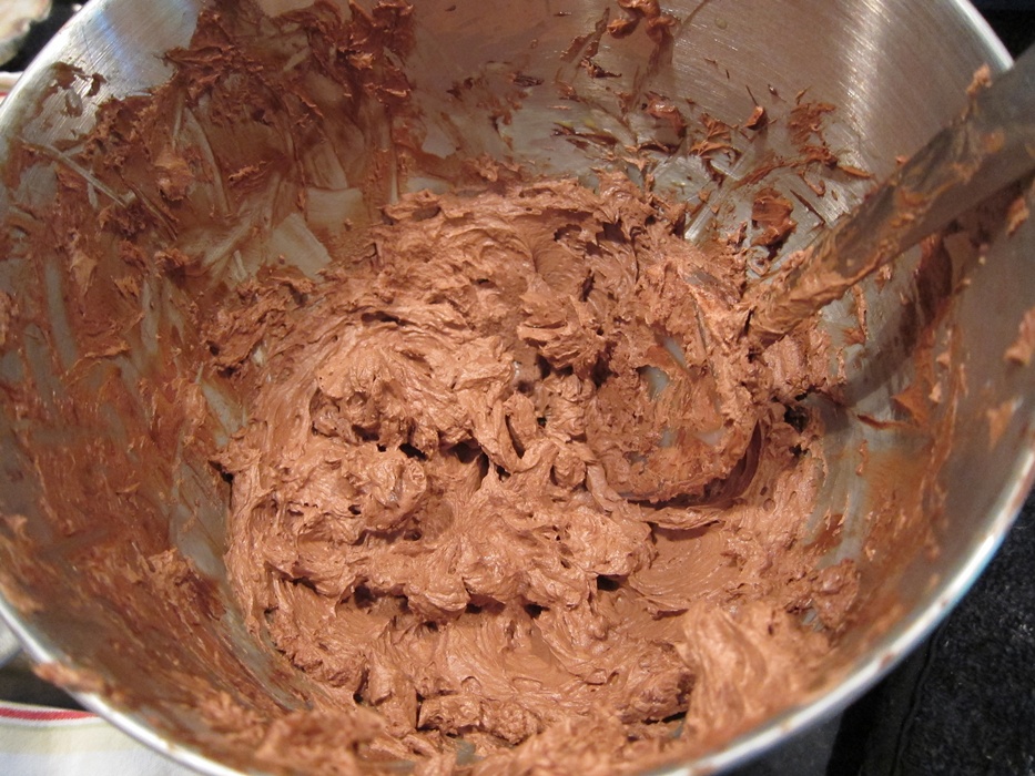 To make the frosting, first melt the chocolate in a double boiler or the microwave, then let cool several minutes. Beat the eggs and butter together, then add in the chocolate. Beat in the almond extract.