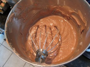 Preheat the oven to 375 degrees. Grease two muffin tins (or one and a 10X10″ pan). In a medium bowl, stir together the flour, hot chocolate powder, baking soda, baking powder, and salt. In another bowl or large measuring cup, combine the butter, sour cream, and buttermilk.