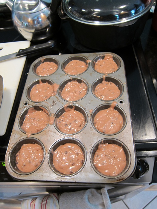 Stir in the chocolate chips, then spoon the batter into the muffin tins, filling halfway.
