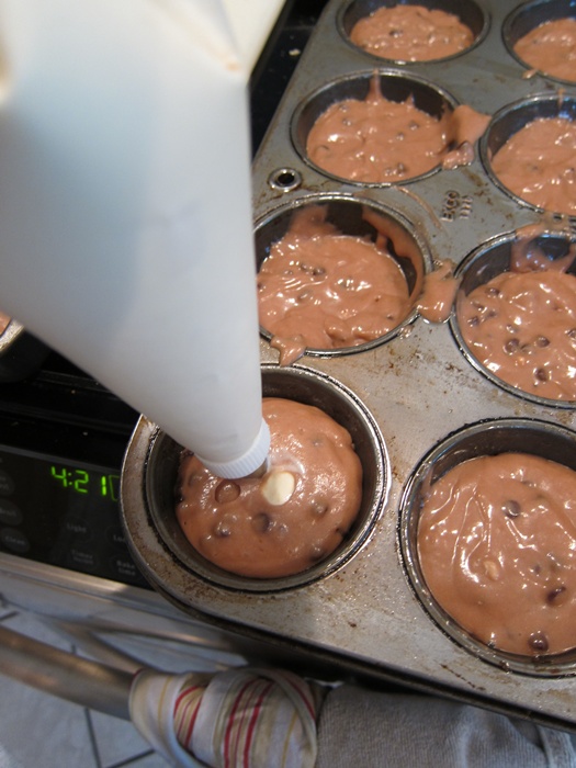 Spoon into a piping bag with a large tip, stick deep into the middle of the batter for a muffin, and squeeze until you see the cream cheese filling around the piping tip.