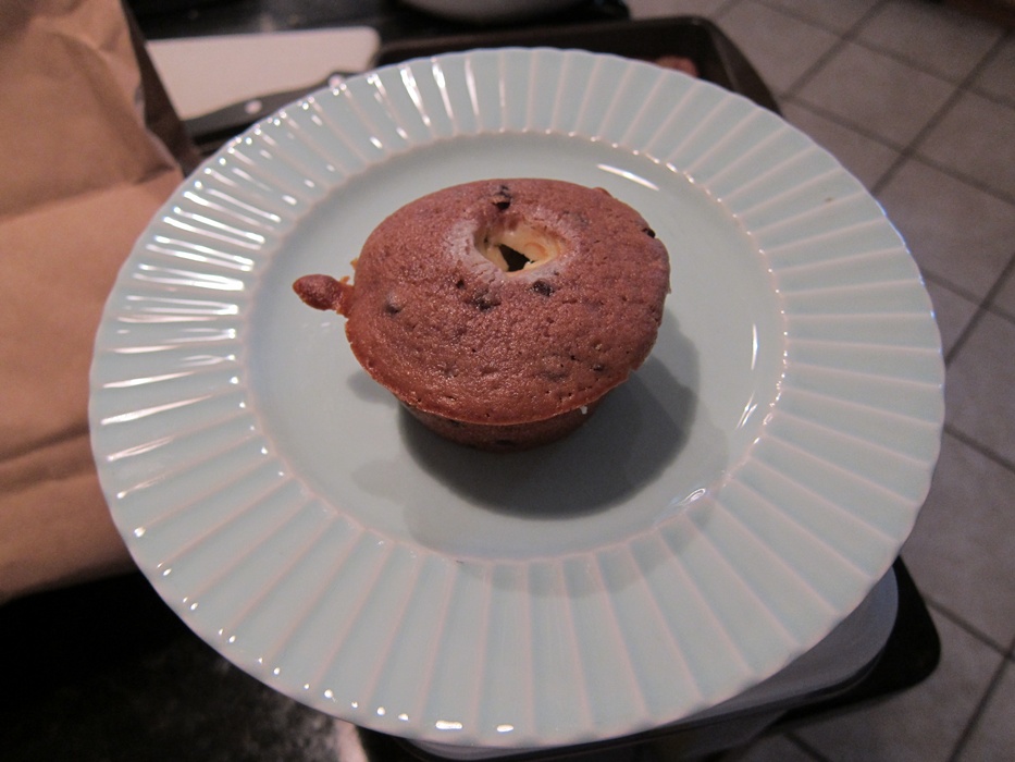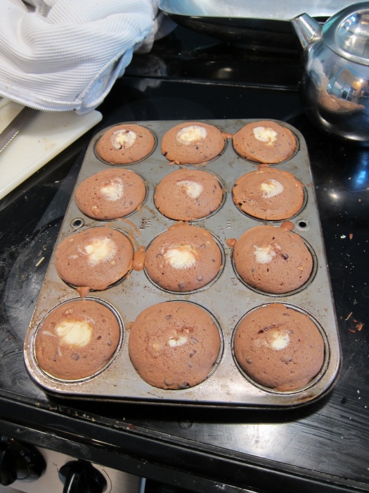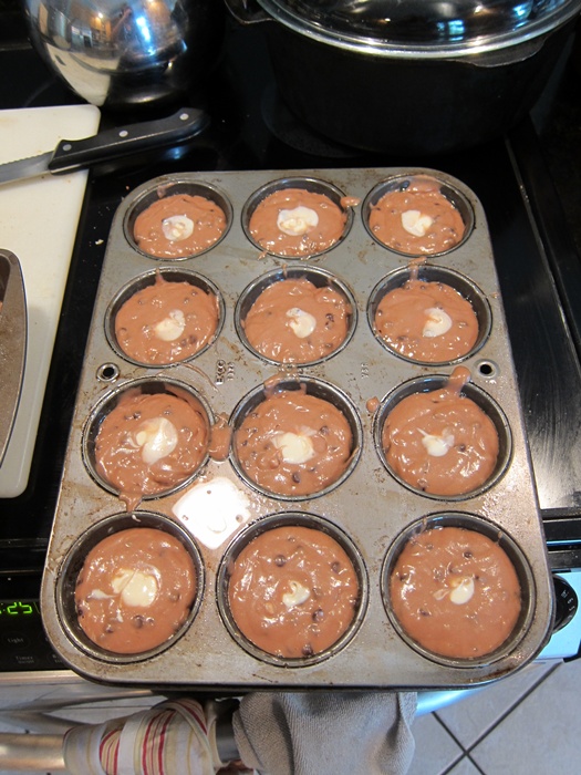 Bake 16-20 minutes (my muffins were done in 16, the bigger cake needed another 3). Test with a toothpick, being sure to test the chocolate part, not the filling.