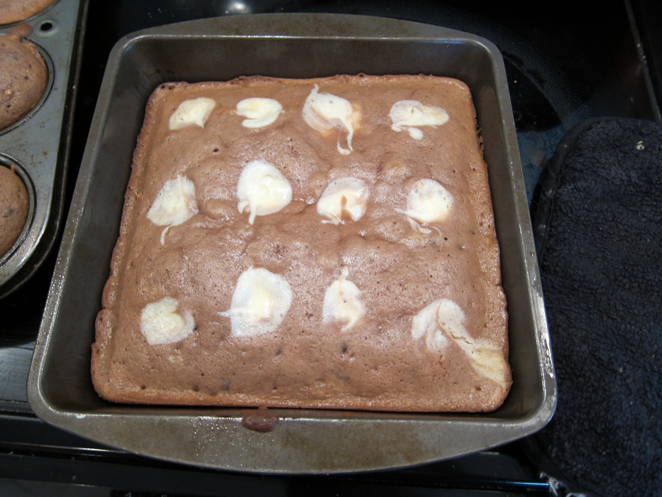 If you’ve used a square pan, just fill it roughly evenly with the cream cheese filling.