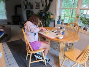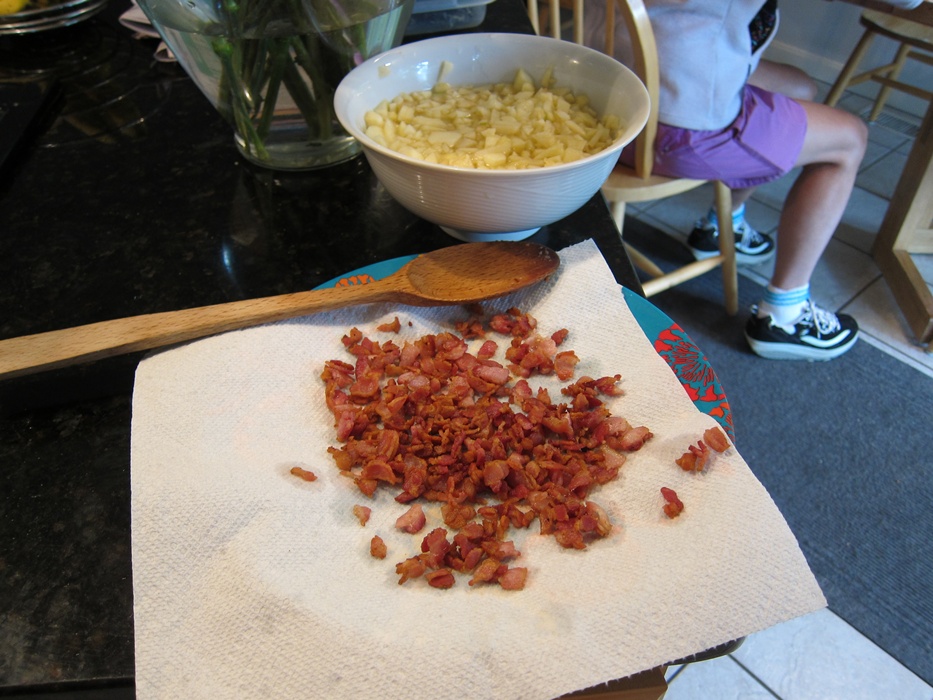 It’s easiest to chop the bacon by just cutting it with scissors over the pan. Cook in a skillet over medium low heat until well browned. Remove the bacon, but leave a tablespoon or so of bacon grease in the pan.