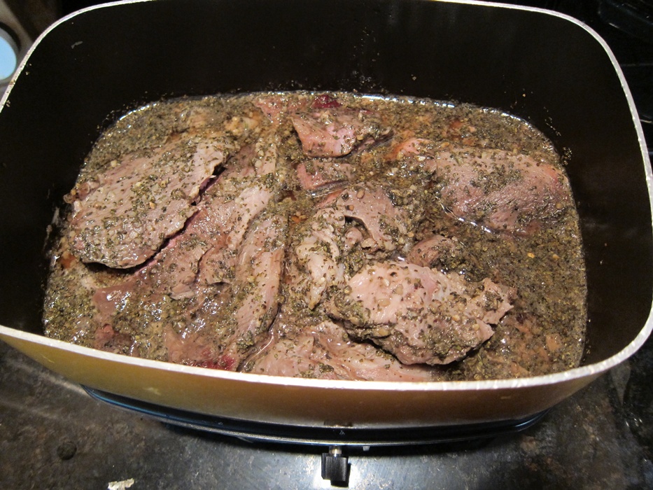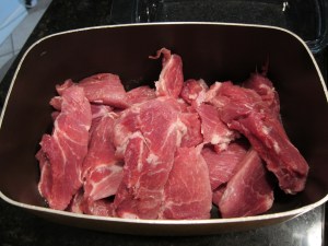 Trim any extra chunks of fat off the pork, and put in a crock pot. Mine was still a bit frozen when I started, so I cut it into roughly centimeter-thick slices to help it cook through.