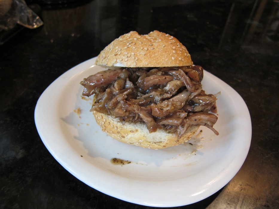 I forgot on Wednesday that I was going to be making this Thursday, and had a pulled pork sandwich for dinner at a restaurant. I think Thursday’s pulled pork wins, by a good margin.