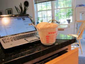 In your blender’s bowl, stir together 1 cup all-purpose flour, 2 cups wheat flour, 1 cup rye flour, the powdered milk, and the salt. Add the mixture from the blender, as well as the yeast mixture. Realize the yeast mixture’s gone crazy while you weren’t paying attention.