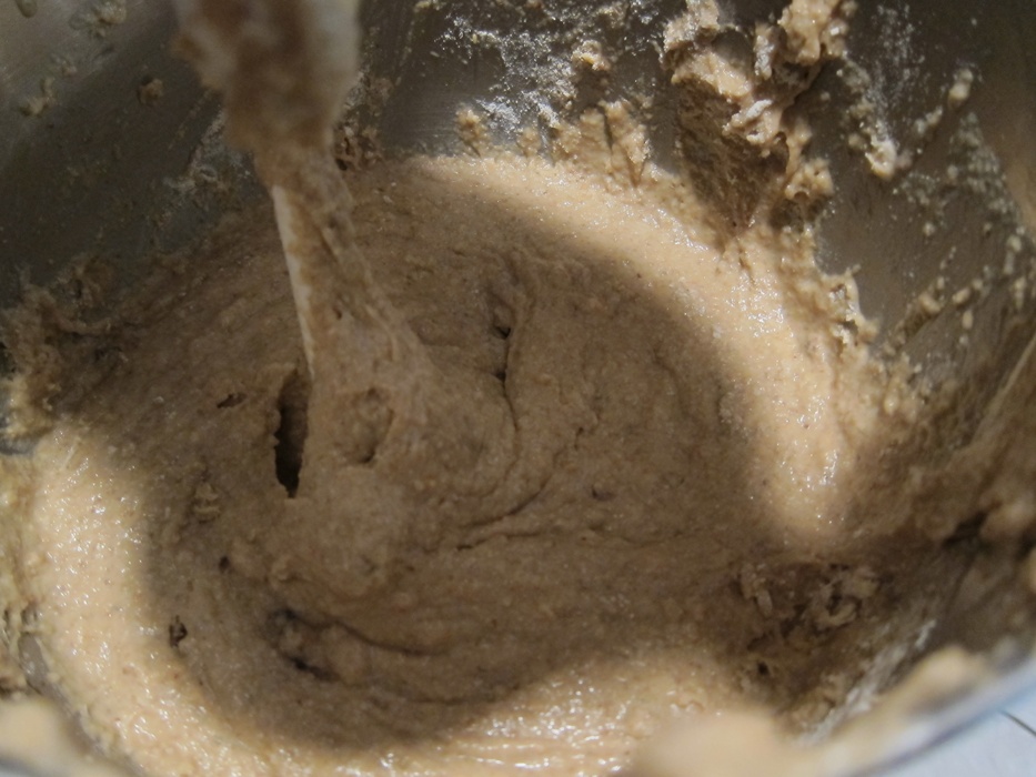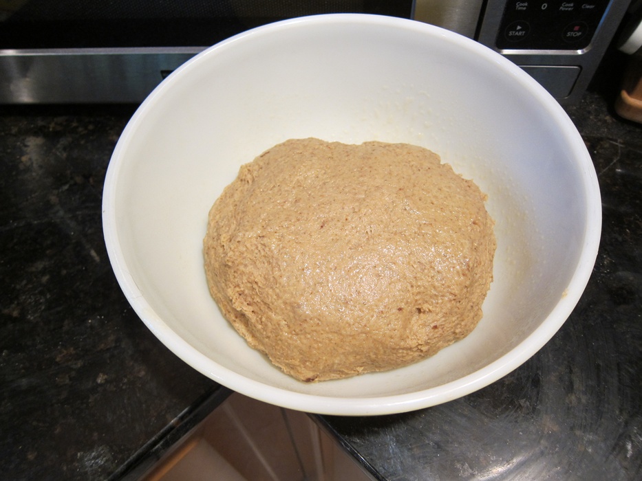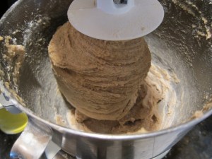 Gradually add enough of the remaining flours (so, up to 1 1/2 cups all-purpose, 1 1/2 cups whole wheat, and 1/2 cup rye) to make the dough tacky, but not sticky. It should start to pull away from the sides of the bowl as it kneads. I added all the all-purpose flour, all the rye, and maybe half of the whole wheat until I reached a texture I was happy with.