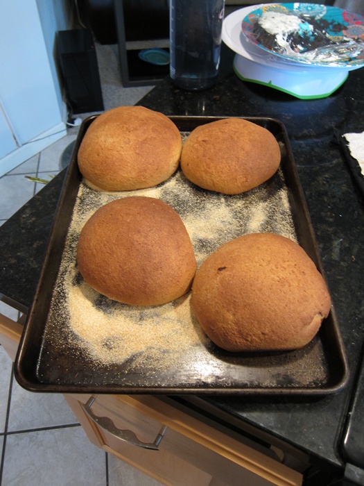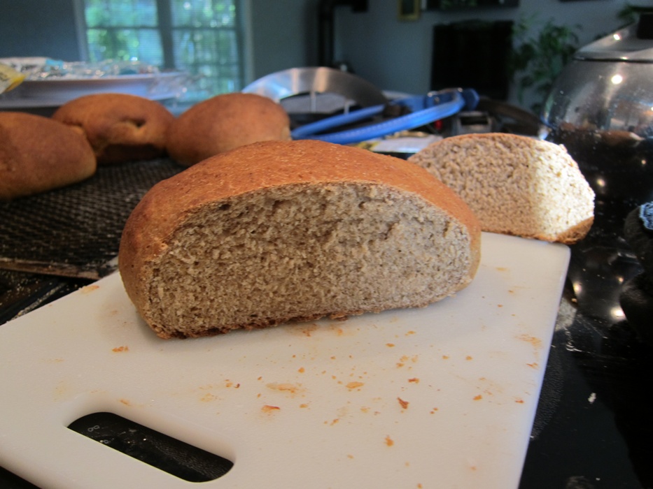 My one reservation with the recipe is that it says to divide the dough into 4 round loaves. I found this made sort of awkward sized loaves. Much too big for one person to eat during one meal, but small enough that only the center pieces make a decent sized sandwich. Next time I make it, I’ll probably put some in a loaf pan, and bake some as small rolls. If you try making sizes other than the 4 round loaves, just remember that smaller things bake faster, and things in a bread pan bake slower.