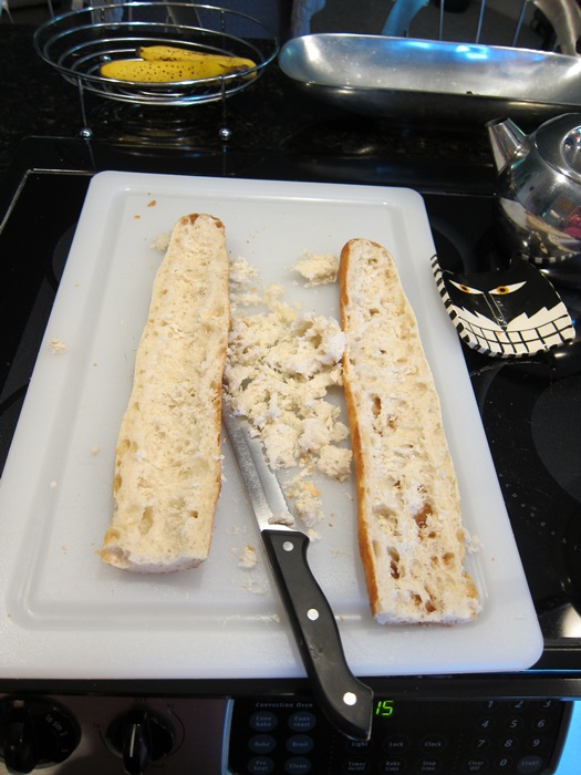 Cut the bread horizontally in two, and pull out most of the middle of the loaf.
