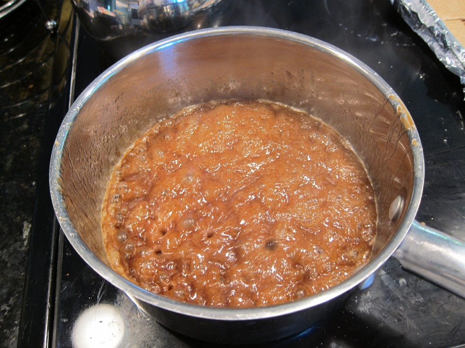 Combine the brown sugar and butter in a pot over medium high heat until the mixture reaches a simmer. Simmer for three minutes. During this time, I like to turn the sink on to as hot as it goes, so that by the time I’m done with the pot, I can get it in steaming hot water immediately, and not have to chip cooled sugar off the pot for a week.
