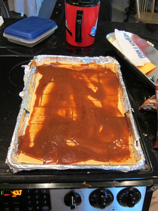 Preheat the oven to 400 degrees. Line a jelly-roll pan with tinfoil. Break the graham crackers along the dotted lines as well as possible, then fill the pan with a single layer of them and set aside.