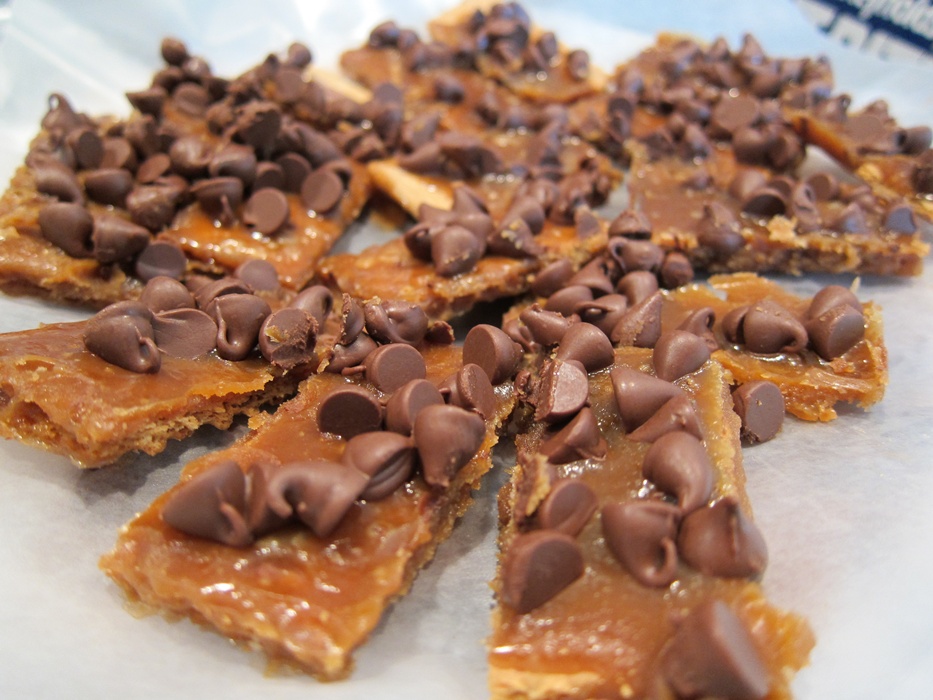 Remove from the oven and sprinkle the chocolate chips evenly over the top. Let cool for several hours until the chocolate chips are firm again, then break into pieces.