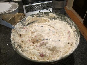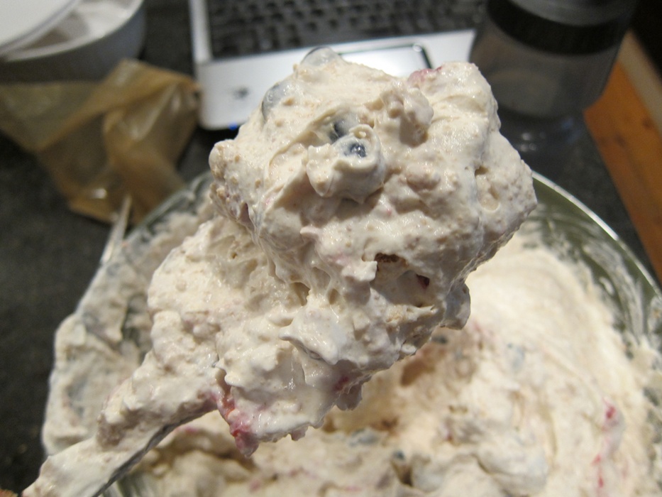 Also, for stirrability, it’s easier if you’ve let the Cool Whip defrost a bit in the fridge for a few hours, but it’s not insurmountable if you don’t.