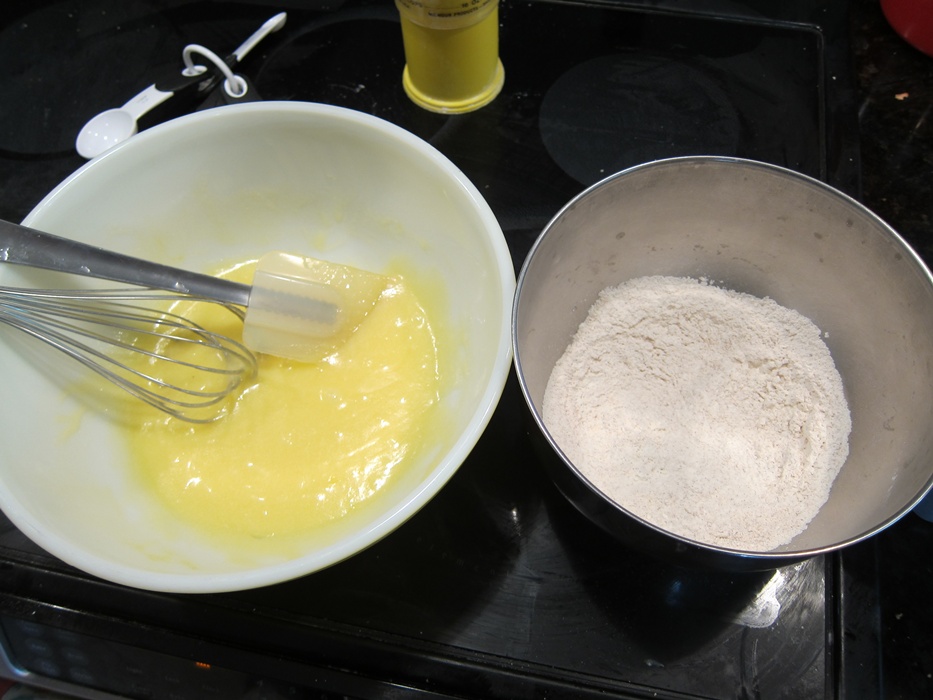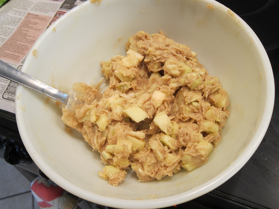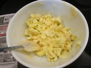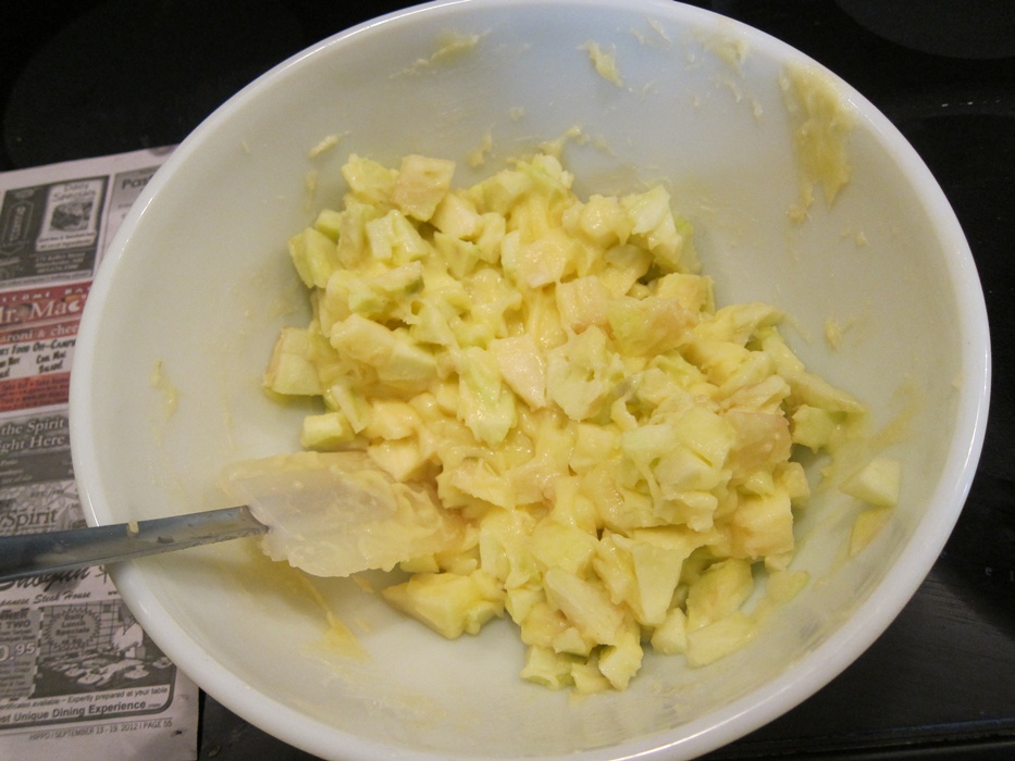 In a large bowl, whisk together the butter, sugar, and egg. I waited until now to peel the apples so they wouldn’t get a chance to go brown.