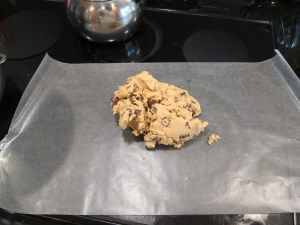 Add the chips, beating just until they’re evenly mixed through the dough, then turn the mixture out onto a piece of wax paper.