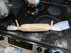 Shape the dough into a log that’s evenly thick. Wrap the wax paper around the log and fold or clip the ends shut. Refrigerate several hours.