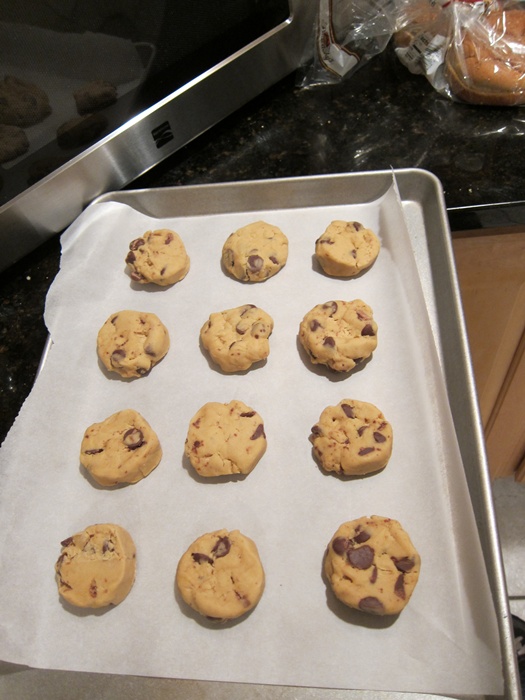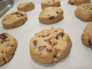 Preheat the oven to 325 degrees and line a baking sheet with parchment. While the oven heats, slice the log into approximately 1/3″ slices and lay on the lined sheet. If the slices crumble when you cut them, you can just press the bits back together and shape them into disks. I think using mini chocolate chips would cut down on crumbling a bit, as it happens mainly when you hit chocolate chips going between two cookies.