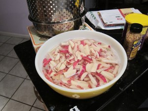Cut the potatoes into 1/4″ wide chunks. If you don’t cut super fast, put the sliced pieces in a bowl of water to keep them from browning. When halfway through cutting the potatoes, put water on to boil in the bottom of a steamer.