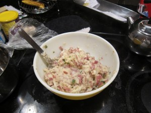 Cut the potatoes into 1/4″ wide chunks. If you don’t cut super fast, put the sliced pieces in a bowl of water to keep them from browning. When halfway through cutting the potatoes, put water on to boil in the bottom of a steamer.Steam the potatoes for 15 minutes, until soft. Even with the double batch, mine were cooked in 15 minutes. While the potatoes cook, whisk together the oil, mustard, and vinegar, then stir in the green onions.