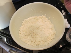 Combine the larger amount of flour with the salt, and cut in the unsalted butter until only tiny pieces remain.