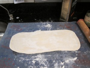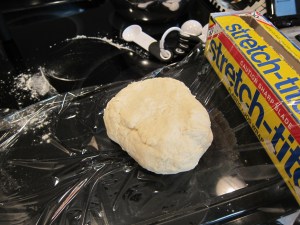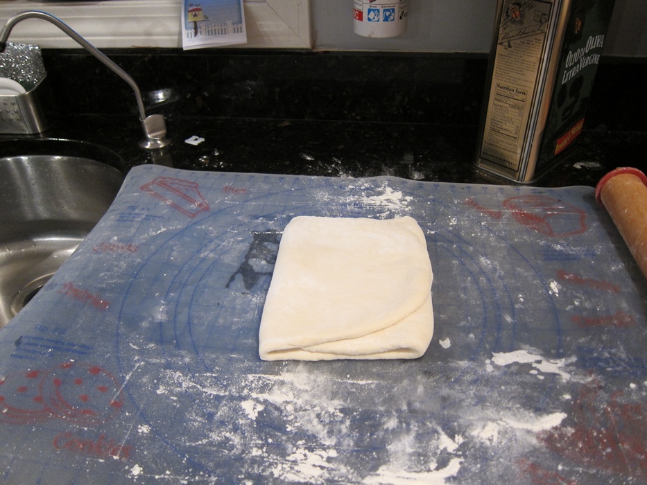 Fold into thirds and roll in the other direction, again until 1/4″ thick. Fold into thirds again, then wrap in plastic and refrigerate at least half an hour.