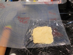 Meanwhile, mix together the salted butter and smaller amount of flour, then shape into a 4.5″ square. Wrap in saran wrap and chill about 15 minutes until solid but workable.