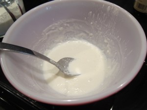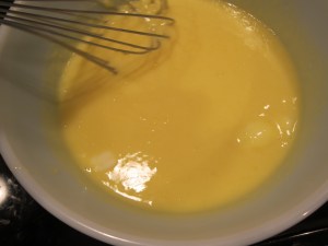Pour the cornstarch mixture in with the remaining hot milk and place on the stove, whisking constantly. The recipe I followed said to bring it back to a boil until it thickens, but I think cooking over low heat until thickened would have been better. I brought mine to a boil, it seemed to thicken a bit, and I took it straight off the heat as I was afraid the egg would cook, and in the end mine didn’t thicken up well. Cooking over low heat will give you a chance to thicken more thoroughly without fear of scrambled eggs.