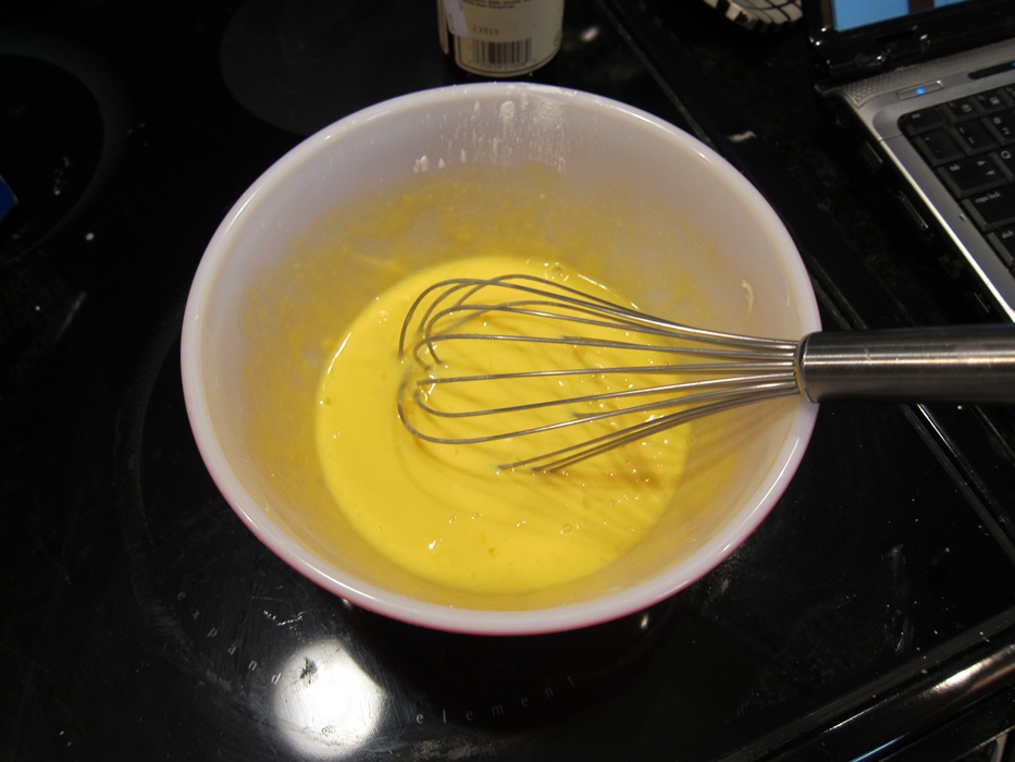 Beat the eggs into the cornstarch mixture, followed by the egg yolks.