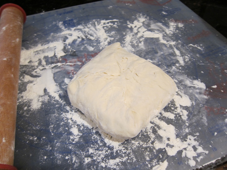 Turn the square seam-side down and roll out into a rectangle 1/4″ thick. Fold into thirds and roll in the other direction, again until 1/4″ thick. Fold into thirds again, then wrap in plastic and refrigerate at least half an hour.