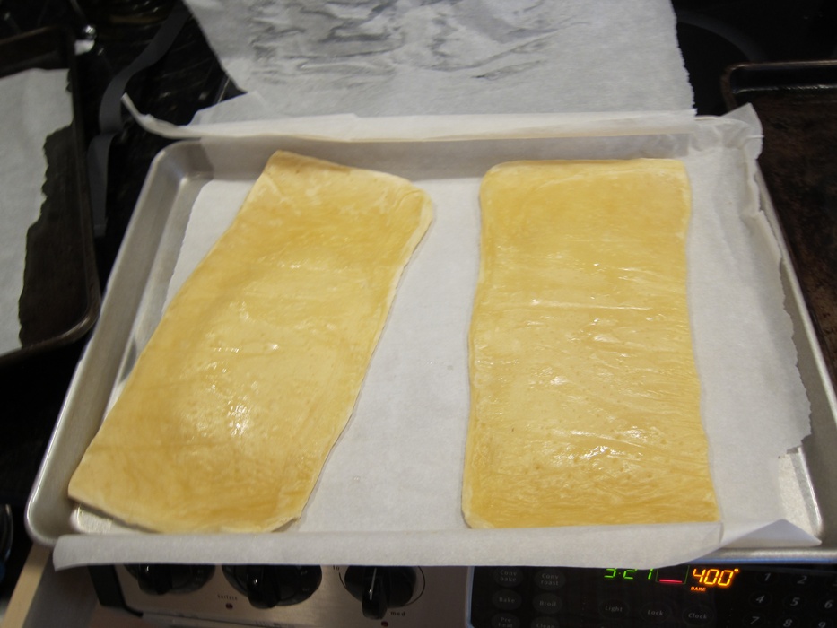 To make the Napoleon, first preheat the oven to 400. Roll out the dough to a 12X18″ rectangle and prick all over with a fork.