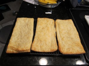 To make the Napoleon, first preheat the oven to 400. Roll out the dough to a 12X18″ rectangle and prick all over with a fork. Cut into 3 even pieces, and transfer to parchment lined baking sheets. Cover the dough with another piece of parchment, then put another baking sheet on top of the dough to weight it down. Do this in batches if you don’t have enough pans to make it all work at once.