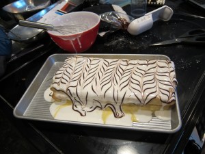 Take the pastry back out of the fridge, and quickly spread the icing over the top. Still working quickly, draw thin lines of chocolate the length of the pastry. I didn’t end up using even half the chocolate, I don’t think. Using a sharp knife, draw lines up and down through the icing and chocolate, creating a pattern.
