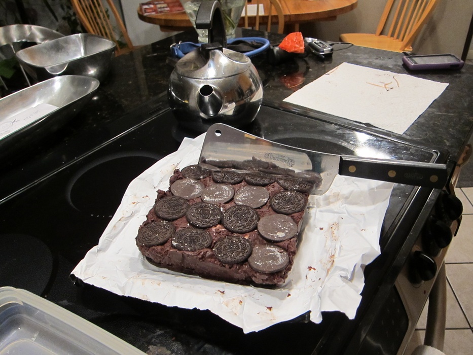 Spread half the mixture over the bottom layer of cookies, then top with a second layer of 16 cookies. Spread the remaining half of the fudge over the second layer of cookies, and top with the remaining 16 cookies. Refrigerate until firm, about 2 hours, then cut into pieces.
