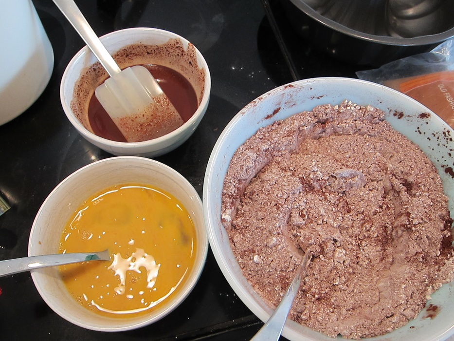 Add the chocolate and beat in on low until combined, then add the dry goods and beat until just combined. This was a large enough amount of dry goods that even adding in two batches, I wished I had used the collar attachment thing that goes over the mixer bowl and keeps things from exploding out. I recommend getting in there with a spatula and just wetting the dry goods a bit before the mixer starts stirring, or you’re going to be cleaning flour off everything in a three foot radius.