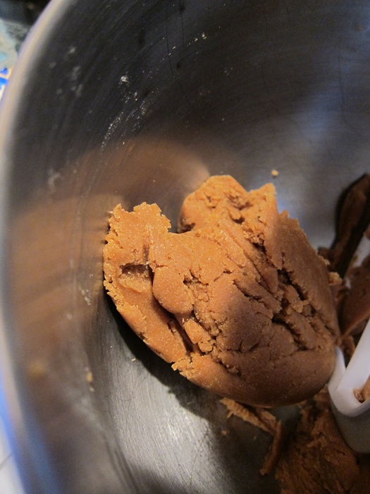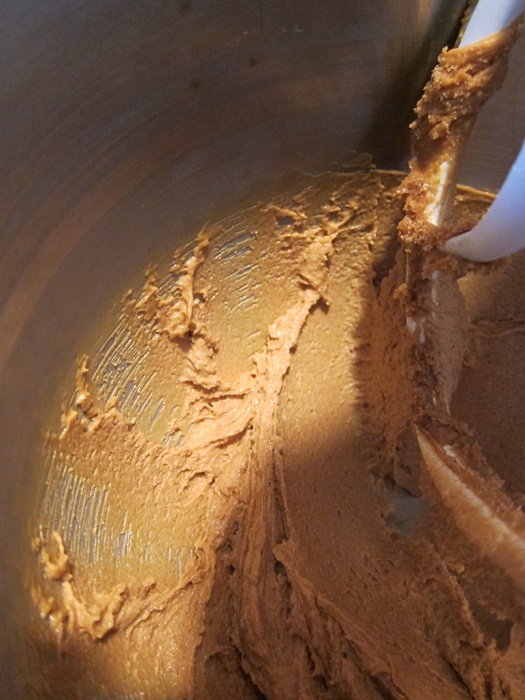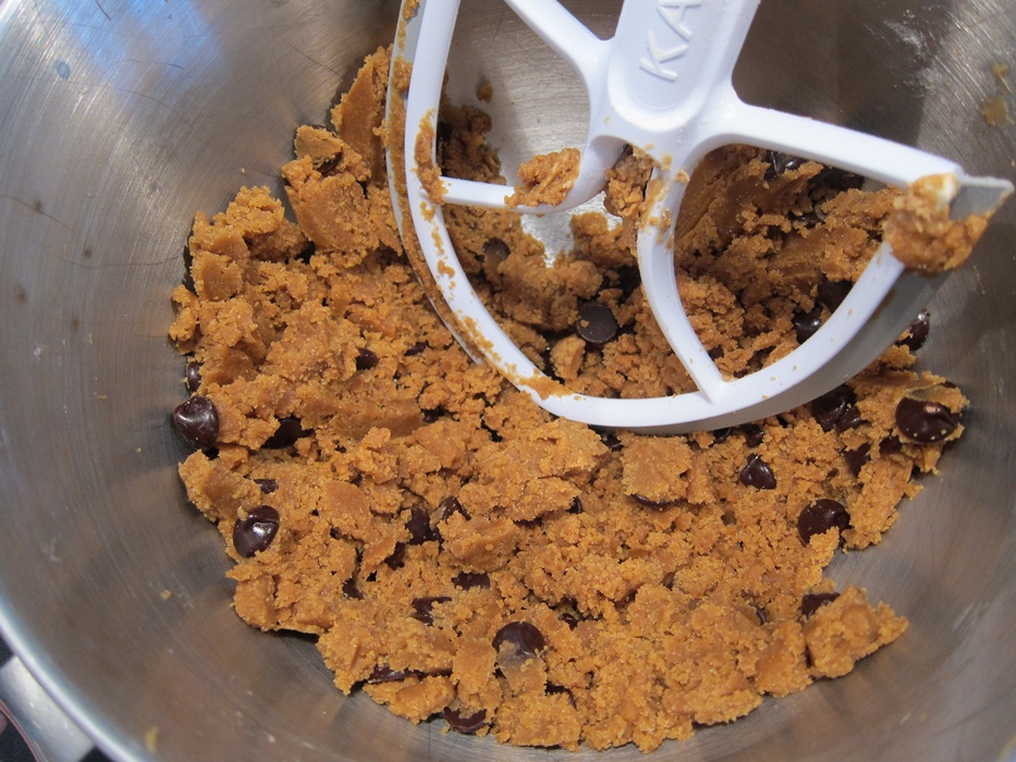 Add the chocolate chips and beat for another few seconds to mix them in. This kinda crumbled up the lumps of dough that had come together, but the dough would still back together if pressed.