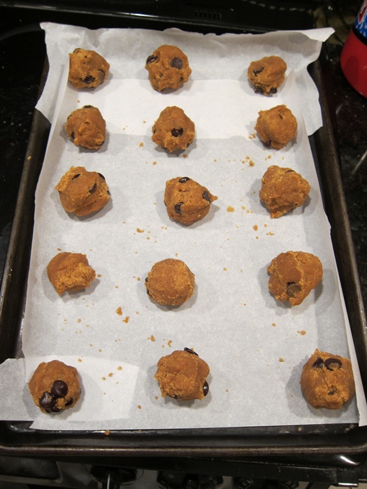 Preheat the oven to 365 degrees and grease or line a cookie sheet. Scoop the dough into tablespoon-sized balls and pack the dough together in your hands. Bake 12-15 minutes, until lightly browned. Cool on the sheet for a while, then enjoy!