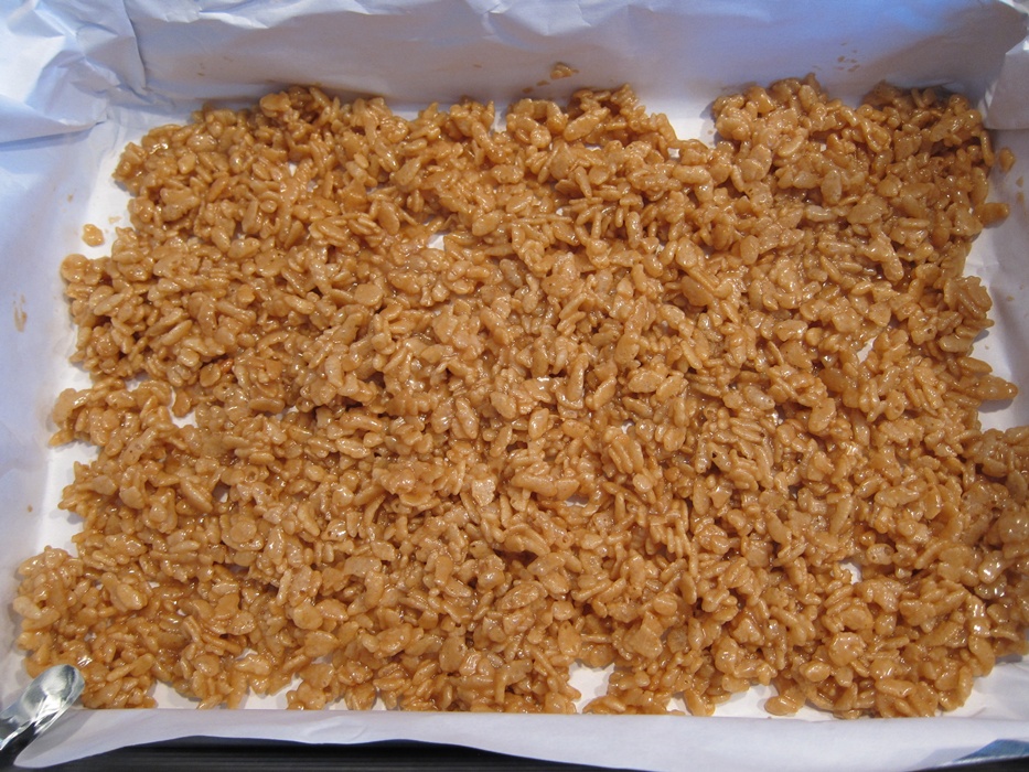 Add the pinch of salt, then pour the mixture over the cereal and stir well. Scoop into the lined pan, wet hands slightly, and spread evenly.
