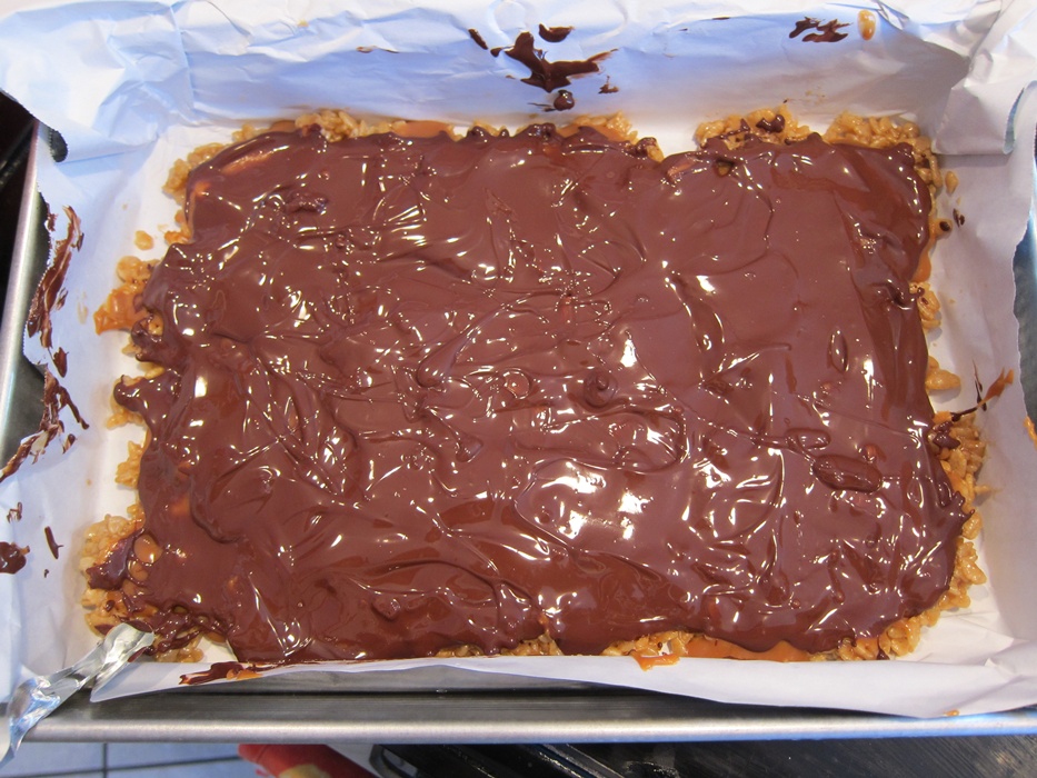 Place back in the fridge or freezer while you melt the chocolate and coconut/Crisco either over the stove on low heat, or in the microwave. Spread the chocolate on top.